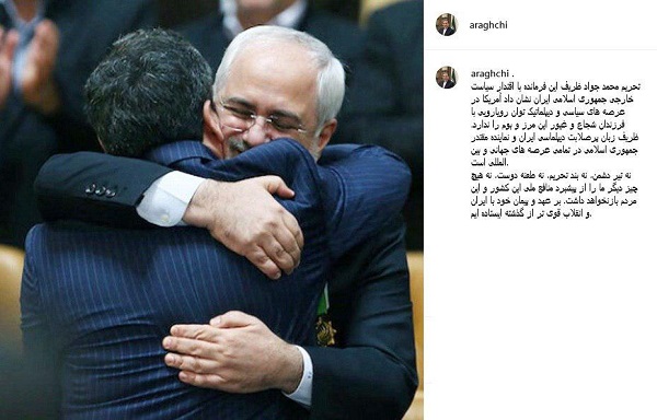 عراقچی همچنین گفت: ظریف زبان پرصلابت دیپلماسی ایران و نماینده مقتدر جمهوری اسلامی در تمامی عرصه های جهانی و بین المللی است. نه تیر دشمن، نه بند تحریم، نه طعنه دوست، نه هیچ چیز دیگر ما را از پیشبرد منافع ملی این کشور و این مردم بازنخواهد داشت. بر عهد و پیمان خود با ایران و انقلاب قوی تر از گذشته ایستاده ایم.