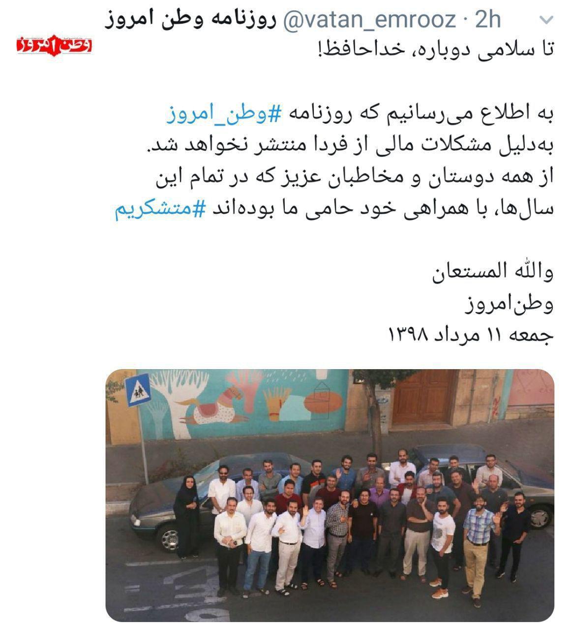 روزنامه "وطن امروز" اعلام کرد که از امروز شنبه دیگر منتشر نمی شود. این روزنامه در نوشته ای در صفحه اینستاگرامی خود اعلام کرد: به اطلاع می‌رسانیم که روزنامه وطن امروز به‌دلیل مشکلات مالی از فردا منتشر نخواهد شد.