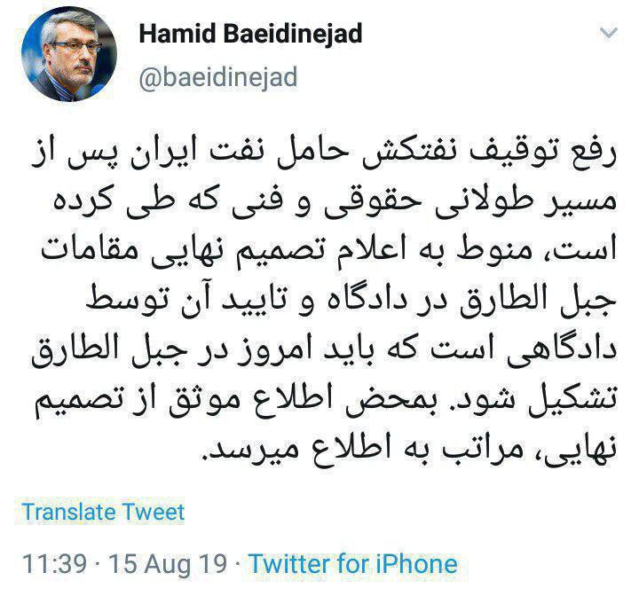 توئیت سفیر ایران در لندن درباره احتمال رفع توقیف نفتکش ایرانی