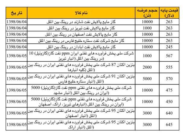 بر این اساس محصول گاز مایع از انبارهای شازند، تبریز، اصفهان و آبادان و همچنین توسط شرکت نفت ستاره خلیج فارس، محصول نفت‌گاز از انبارهای مشهد، تبریز، اراک و اصفهان، بنزین ۹۵ از انبارهای اصفهان و اراک، بنزین ۹۱ از انبار پالایشگاه ستاره خلیج فارس و بنزین ۸۷ از کلیه انبارهای شرکت ملی پخش در بازار فرآورده‌های هیدروکربوری بورس انرژی عرضه می شود.