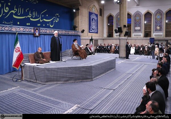 رئیس جمهور در این دیدار که در سالروز ولادت با سعادت حضرت ختمی مرتبت محمد مصطفی (ص) و حضرت امام جعفر صادق (ع) انجام شد؛ با تبریک عید سعید میلاد پیامبر عظیم الشان اسلام (ص) و فرزند برومندش امام جعفر صادق (ع) به محضر رهبر انقلاب اسلامی، همه مسلمانان جهان، ملت بزرگ ایران، سفرای اسلامی مقیم در تهران و همچنین میهمانان کنفرانس وحدت اسلامی گفت: زاده امروز، در جهان و دنیایی پا به عرصه وجود گذاشت که سراسر آن را تبعیض، فساد، ظلم، جنگ و خونریزی فرا گرفته بود و افتخار آنها به قبیله، قدرت بازو و شمشیر و هدف آنها استیلا بر اموال و سرزمین دیگران بود.