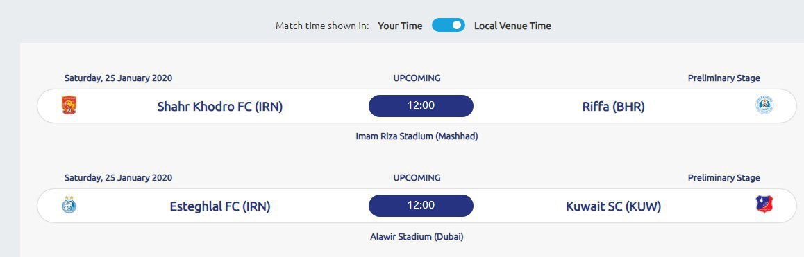 همچنین تیمهای استقلال ایران و الکویت کویت در همین روز (5 بهمن) باید در ورزشگاه العویر شهر دبی به مصاف هم بروند.