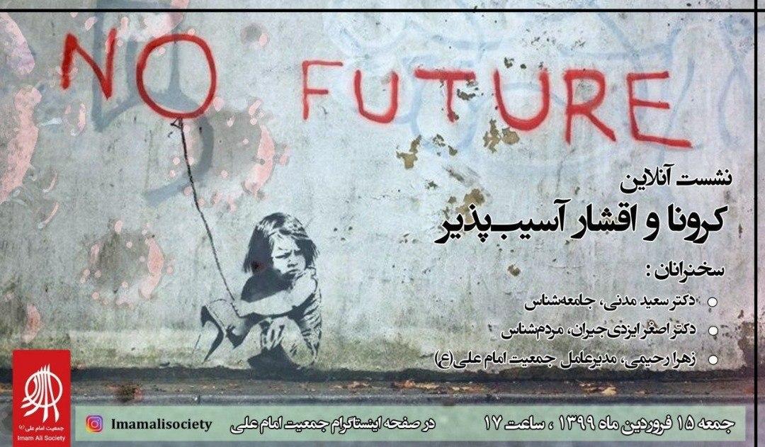 جمعه ۱۵ فروردین ۹۹ نشستی به صورت آنلاین با موضوع «کرونا و اقشار آسیبپذیر» به صورت زنده در صفحهی اینستاگرام جمعیت امداد دانشجویی_مردمی امام علی (ع) برگزار شد. در این نشست سعید مدنی جامعهشناس، اصغر ایزدیجیران مردمشناس و زهرا رحیمی مدیرعامل جمعیت امام علی (ع) حضور داشتند.