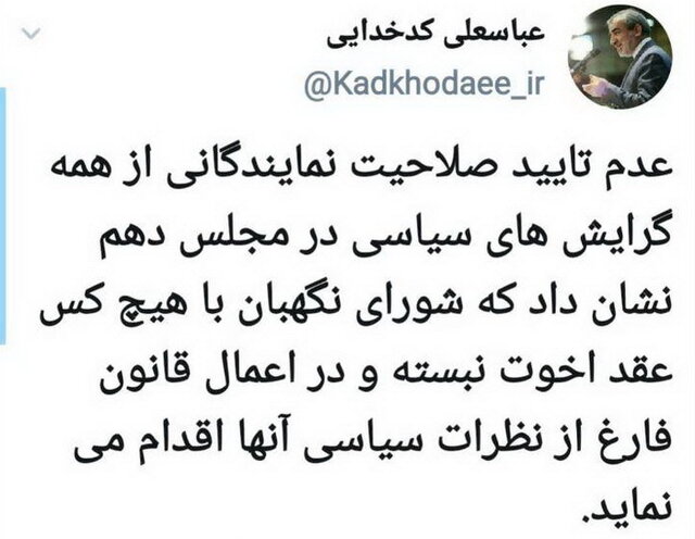 به گزارش ایسنا، عباسعلی کدخدایی در توییتر نوشت: «عدم تایید صلاحیت نمایندگانی از همه گرایش‌های سیاسی در مجلس دهم نشان داد که شورای نگهبان با هیچ‌کس عقد اخوت نبسته و در اعمال قانون فارغ از نظرات سیاسی آنها اقدام می‌نماید.»