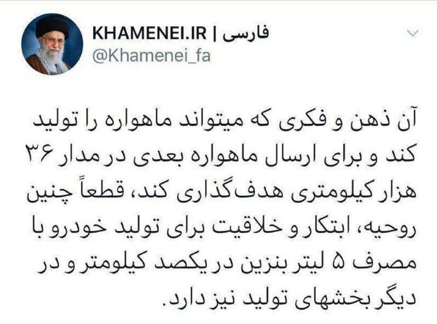 صفحه توئیتر رهبر معظم انقلاب نوشت: آن ذهن و فکری که می تواند ماهواره را تولید و برای ارسال ماهواره بعدی هدفگذاری کند، قطعا توان تولید خودرو با مصرف پنچ لیتر بنزین در صد کیلومتر نیز دارد.