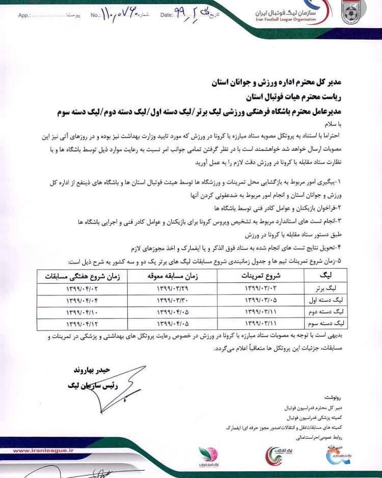 به گزارش عصرایران به نقل از ورزش سه، در نامه ای که حیدر بهاروند رئیس سازمان لیگ آن را نوشته و به مدیرکل اداره ورزش و جوانان تهران، ریاست هیئت فوتبال تهران و مدیران عامل باشگاه ها ارسال کرده که در ان زمان آغاز تمرینات و مسابقات مشخص شده و همچنین الزاماتی برای تمرین و بازی در نظر گرفته شده است.