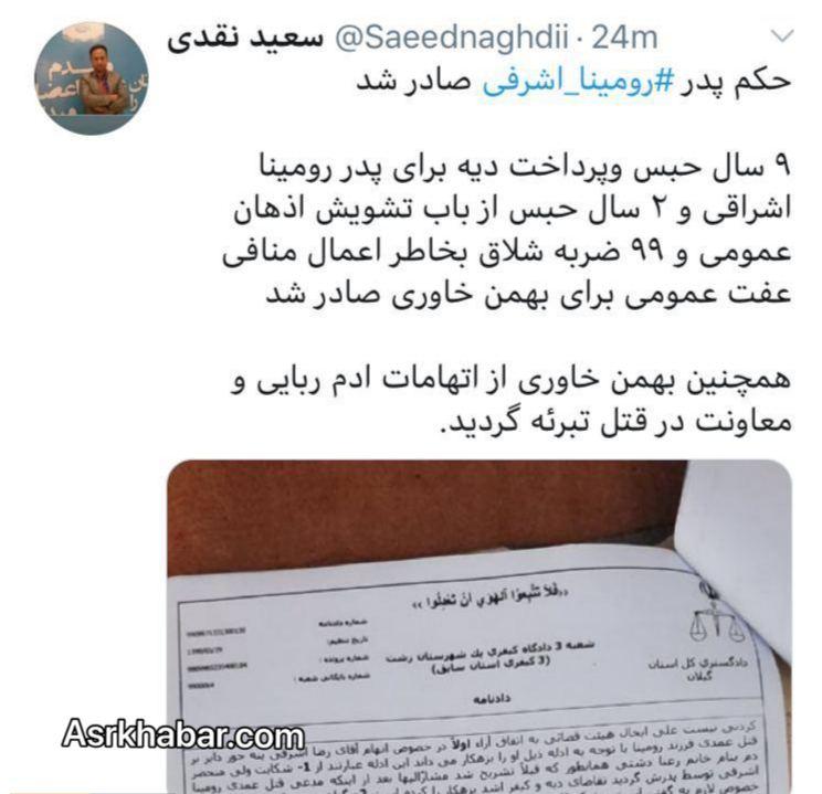 9 سال حبس برای پدر ⁧رومینا اشرفی