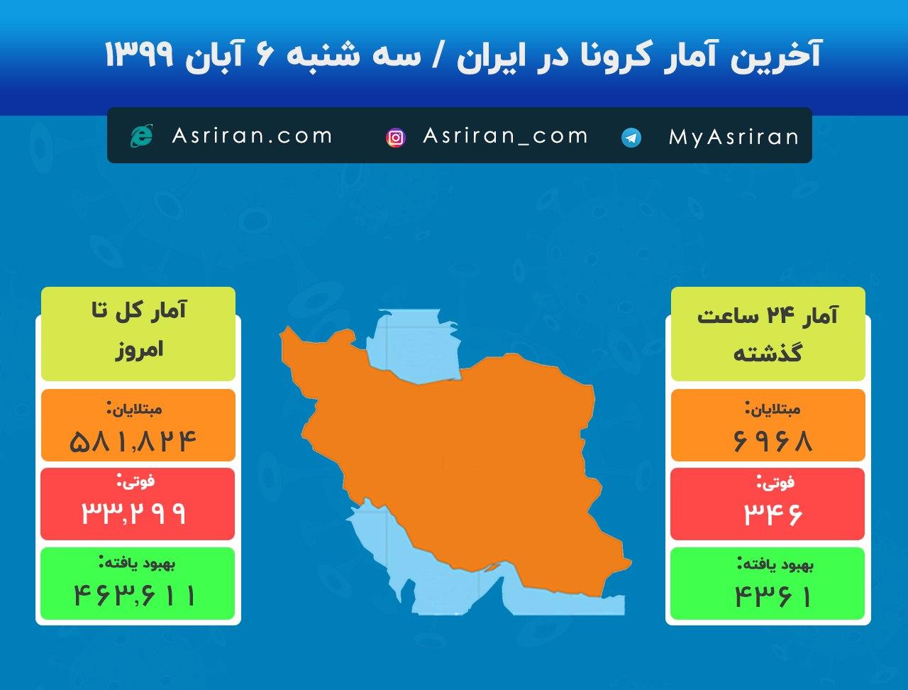 آخرین آمار کرونا در ایران / سه شنبه 6 آبان 99 (اینفوگرافیک)