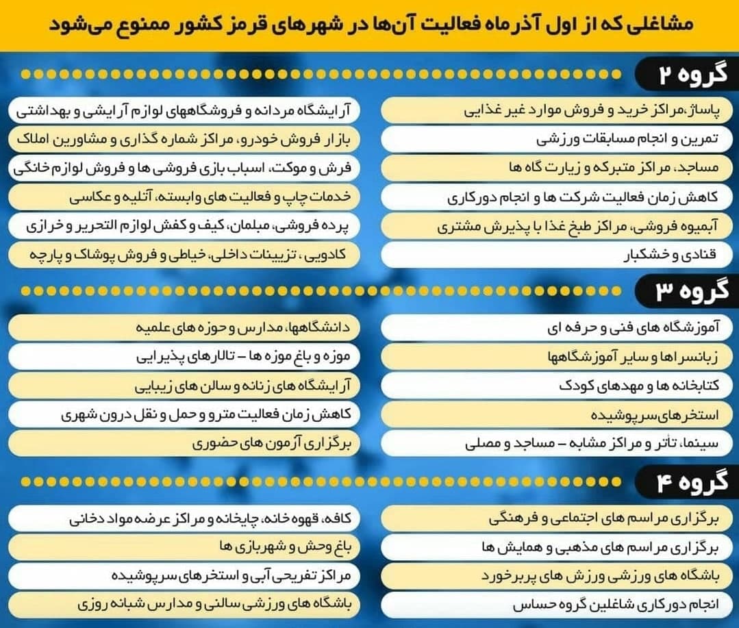 مشاغلی که از اول آذر در شهرهای قرمز تعطیل می‌شود