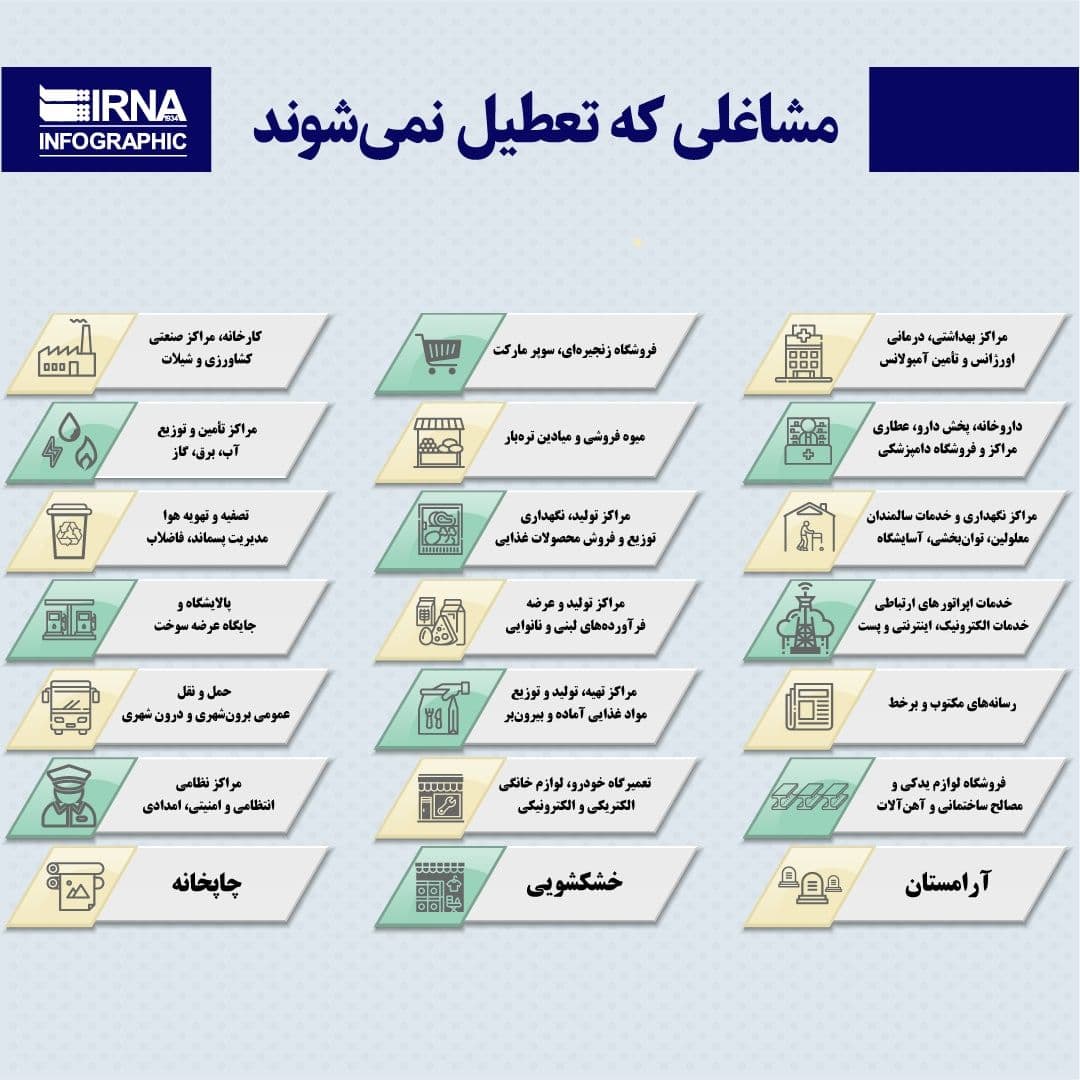 در پی تصویب محدودیت‌های جدید کرونایی در آذرماه، ستاد ملی مدیریت بیماری کرونا در اطلاعیه‌ای فهرست مشاغل گروه یک را که در هیچ یک از وضعیت‌های سه‌گانه (قرمز، نارنجی و زرد) تعطیل نمی‌شوند، اعلام کرد.