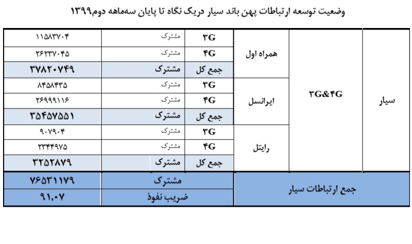 نود فناوری – یافتن پاسخ قسمت اول این سوال کار ساده ای است. آمارها پاسخ ها را نشان می دهند. براساس گزارش سازمان تنظیم مقررات و ارتباطات رادیویی که در جدول زیر مشاهده می شود مجموع تعداد مشترکان ۳G و ۴G دو اپراتور همراه اول و ایرانسل به ترتیب در حدود ۳۷ و ۳۵ میلیون نفر است.