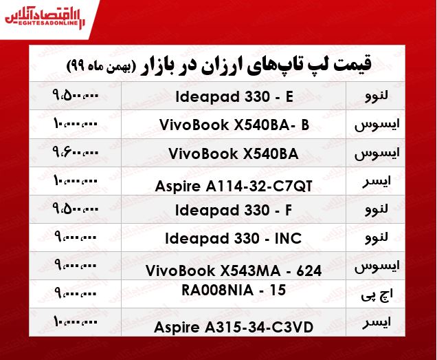 آنچه در زیر می آید ارزانترین لپ تاپهای موجود در سطح بازار تهران است.