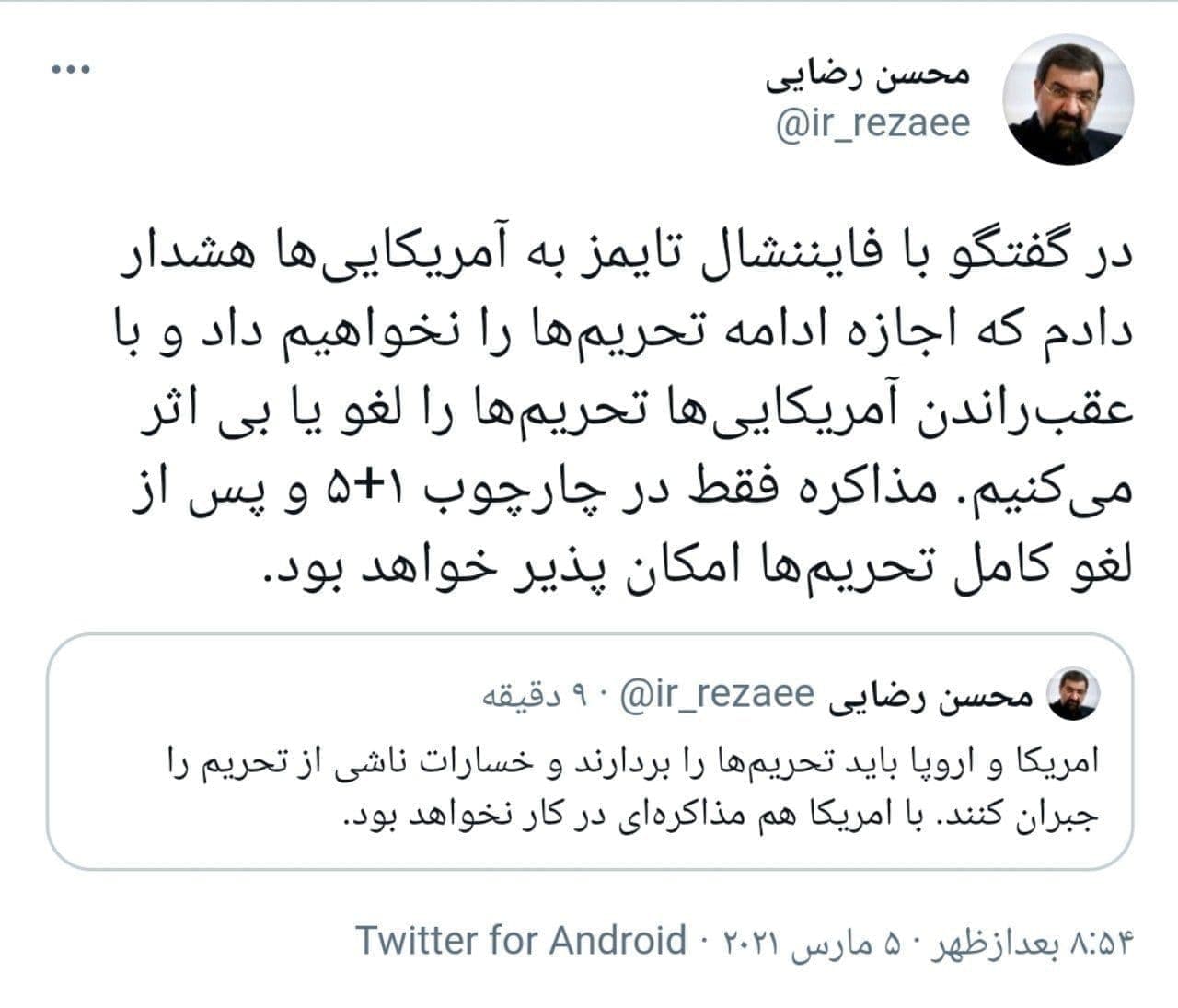 محسن رضایی: مذاكره فقط در چارچوب ٥+١