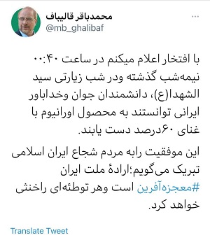 قالیباف رئیس مجلس در توئیتی نوشت: