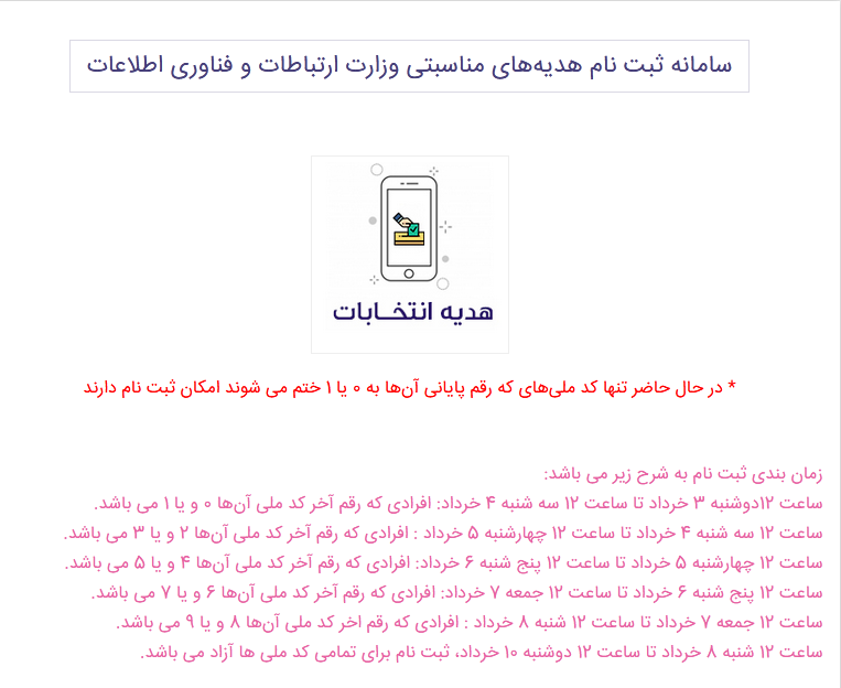 آذری جهرمی همچنین گفته بود که به منظور ترویج تبلیغات انتخابات در فضای مجازی به جای تجمعات خیابانی و میدانی، هفت گیگابایت اینترنت یک ماهه رایگان به همه مردم ایران دارای سیمکارت و با ارائه کد ملی عرضه میشود و افراد میتوانند با مراجعه به www.ictgifts.ir نسبت به ثبتنام اقدام کنند.