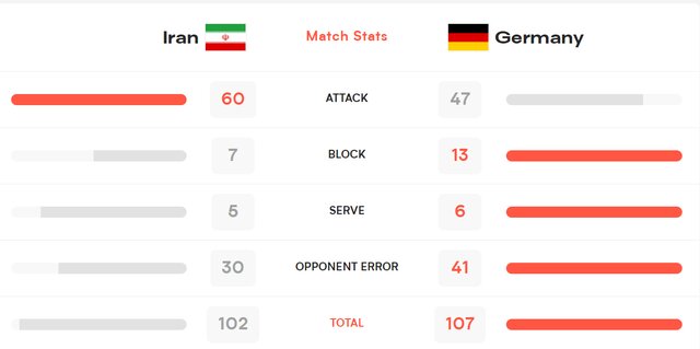 تیم ملی والیبال ایران در این بازی ۶۰ امتیاز ار حمله به دست آورد درحالی که تیم ملی آلمان در این بخش تنها به کسب ۴۷ امتیاز بسنده کرد.