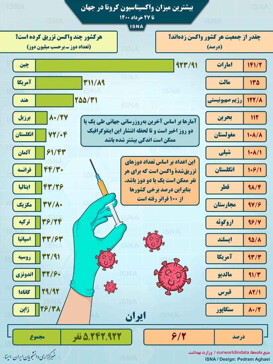 واکسیناسیون کرونا در جهان تا ۲۷ خرداد (اینفوگرافیک)