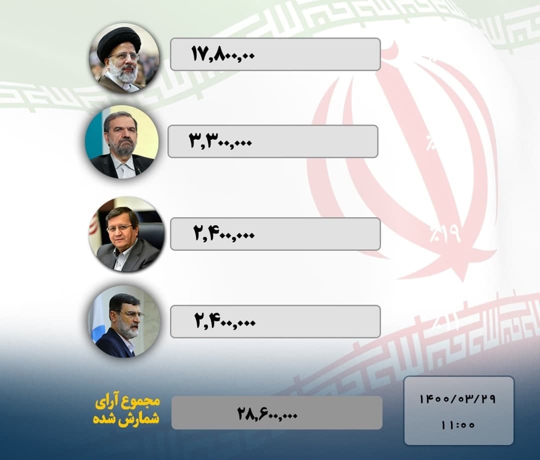 بر اساس شمارش ۲۸ میلیون و ۶۰۰ هزار رای، سید ابراهیم رئیسی بیش از ۱۷میلیون و ۸۰۰ هزار رای کسب کرده‌اند. "آرای باطله" نیز با بیش از 4 میلیون رای در جایگاه دوم قرار گرفت.