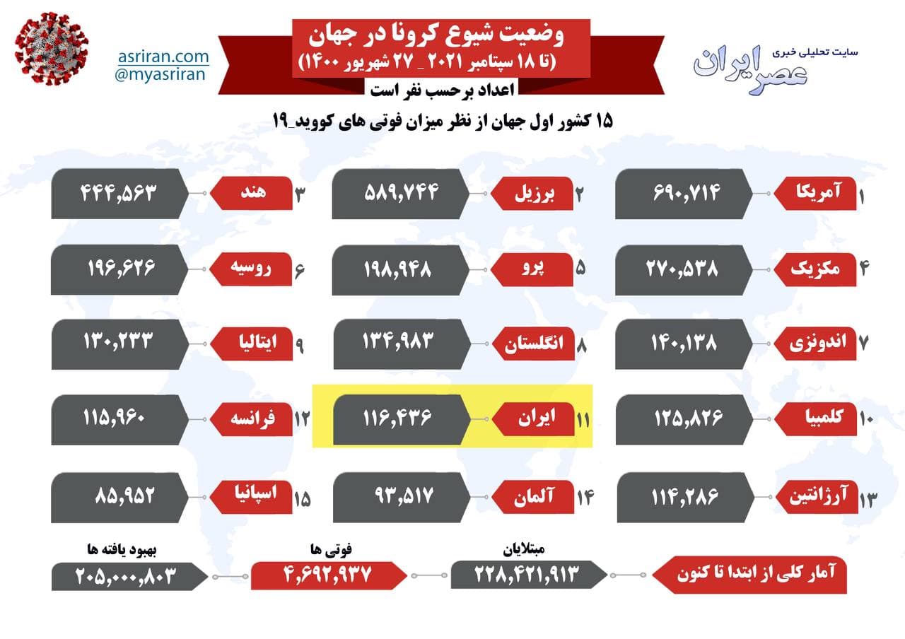 روند شیوع کرونا در جهان، شنبه ۲۷ شهریور (اینفوگرافیک)