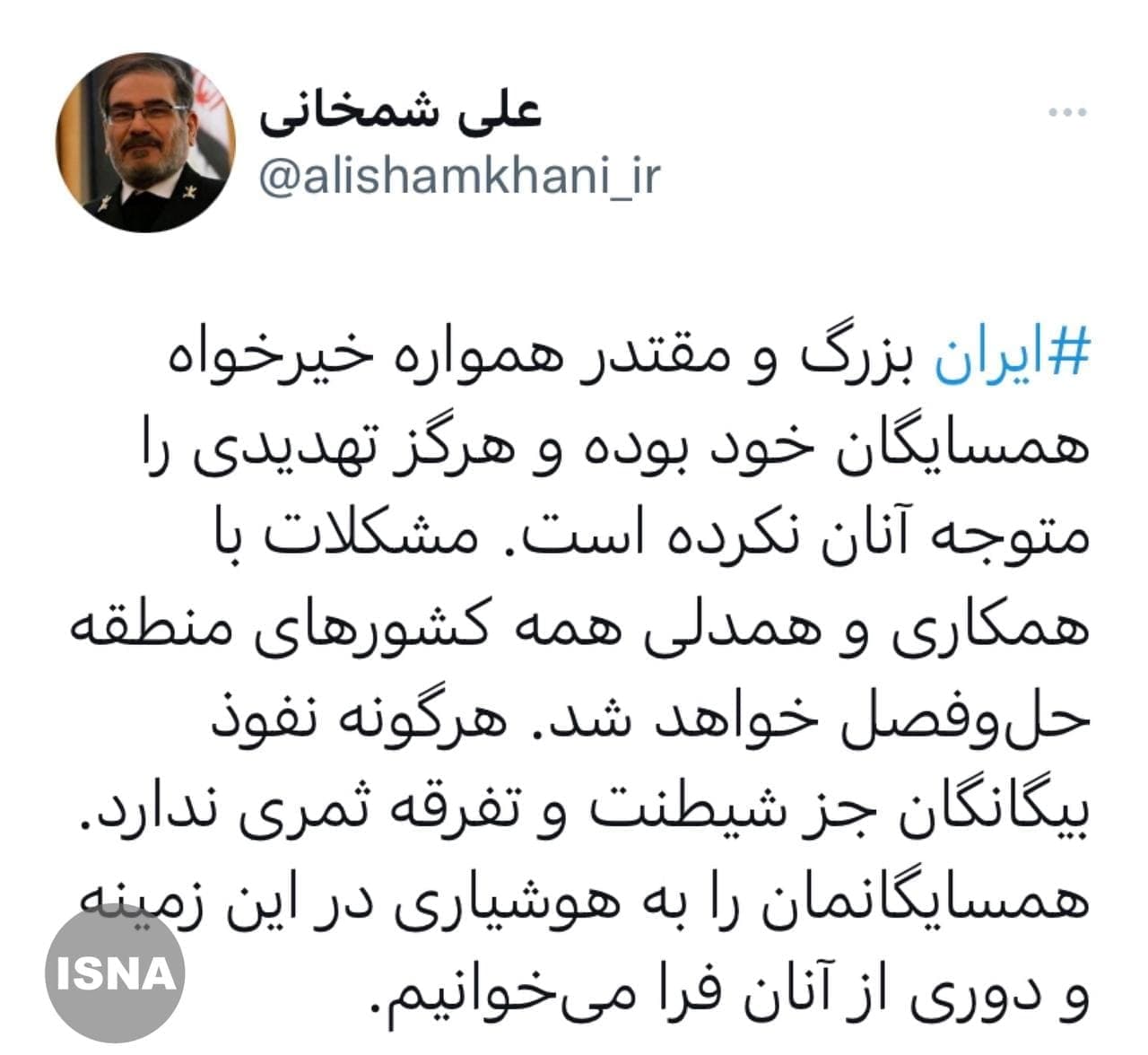 شمخانی: ایران همواره خیرخواه همسایگان است نه تهدید
