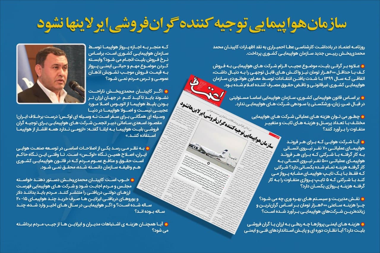 رییس جدید سازمان هواپیمایی کشوری در بخش دیگری از مصاحبه اش گفته:« نگرانی اصلی در این زمینه این است که کاهش قیمت یا ارزان فروشی غیر منطقی هم نشاندهنده صرف نظر کردن یک ایرلاین از یکی از آیتمهای مربوط به هزینههای ثابت مانند سوخت، مالیات، نکات مربوط به مسائل ایمنی و ... است و اگر قیمت بلیت هواپیما بیش از حد کاهش پیدا کند سازمان هواپیمایی ورود پیدا خواهد کرد» در این بیان چند نکته به نظر می رسد که کاپیتان محمدیبخش باید به آن ها پاسخ دهد.