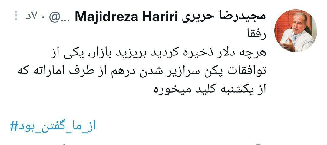 مجیدرضا حریری، رییس اتاق بازرگانی ایران و چین، ساعتی بعد از اعلام خبر از سرگیری روابط ایران و عربستان در توییتی نوشت: رفقا هرچه دلار ذخیره کردید بریزید بازار، یکی از توافقات پکن سرازیر شدن درهم از طرف اماراته که از یکشنبه کلید میخوره